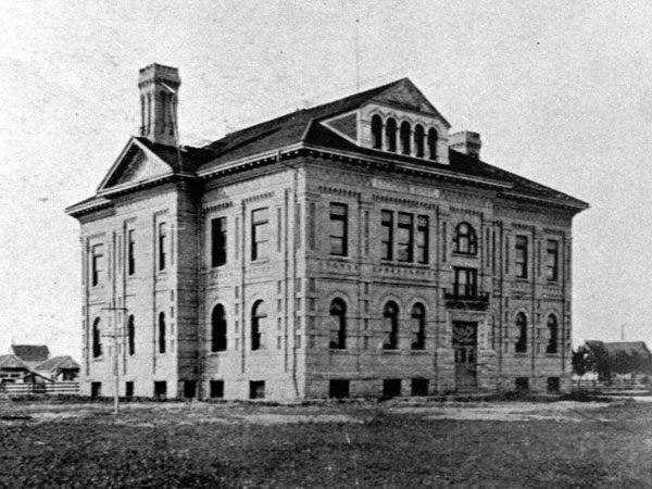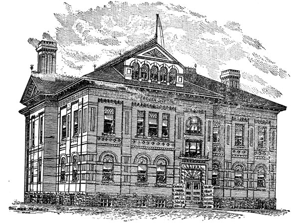 This site between Flora and Stella avenues was the site for two Aberdeen schools. Named for John Campbell Gordon, the First Marquess of Aberdeen and Governor-General of Canada from 1893 to 1898, the first school was constructed in 1893 by Kelly Brothers on a design by architect George Creeford Browne, at a cost of $28,000. It was formally opened on 14 December 1893. The brick structure consisted on eight classrooms and an assembly hall, to which six additional rooms were added in 1906. The first classes were held in the building on 11 December 1893.