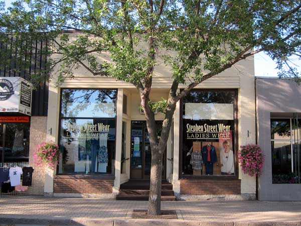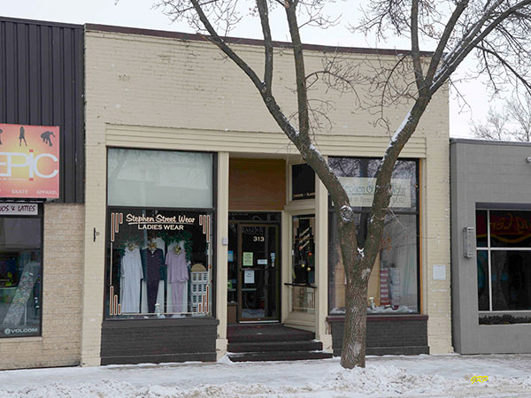 This modest one-storey brick building along Stephen Street in Morden was constructed in 1896 by J. T. Acheson for his retail store that later became Acheson Grocers and incorporated the neighboring building at 317 Stephen. His sons Harold and Bill Acheson took over the business in 1920, based at 317 while son-in-law B. L. Martin operated the dry goods section here. In 1946, Ron, Perry and Don George established George Brothers Electric Company and operated it until at least 1962, after which a McLeod’s store was based here. In 1978, a factory clearance store specializing in outerwear opened in the building.