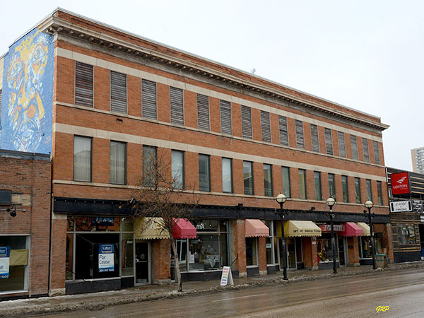This three-storey brick building on Osborne Street in Winnipeg was designed by local architects Samuel Hooper and Charles Henry Walker, and built in 1906 by the Sharpe Construction Company for owner Rodmond Palen Roblin. The street level was occupied by several businesses while the upper two floors had residential apartments. Named the Adelaide Block for Roblin’s wife, in 1909 an addition on the rear of the 99- by 50-foot building was designed by William Wallace Blair.