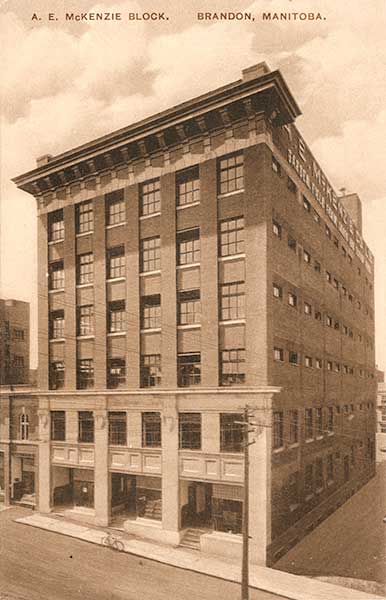 In 1910, the company moved into a seven-storey concrete and brick office was designed by Brandon architect Thomas Sinclair, and constructed for $100,000 by the Brandon Construction Company under the supervision of Thomas M. Harrington. It was the first reinforced concrete building in Brandon (the nearby Clement Block came second, in 1911), and it was the tallest building in Brandon from 1910 to 1973 (when it was surpassed by the 11-storey Scotia Towers). In 1918, a large concrete seed bin at the rear of the building was constructed by the Fegles and Bellows Company. In 1971, the company purchased the Steele-Briggs Seed Company, a large seed business in eastern Canada, and took the trade name of McKenzie Steele-Briggs Seeds, but retained the corporate name of A. E. McKenzie Company. By the 1980s, it was Canada’s only national seed-packing plant and its largest distributor of garden seed.