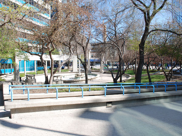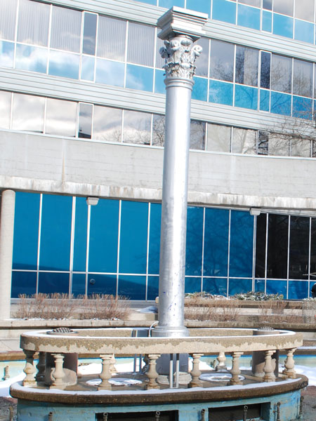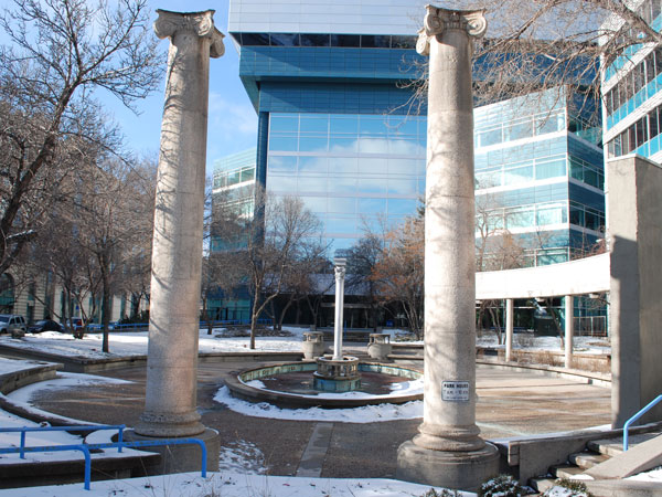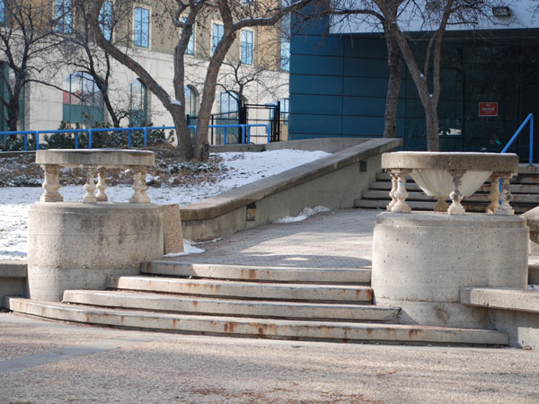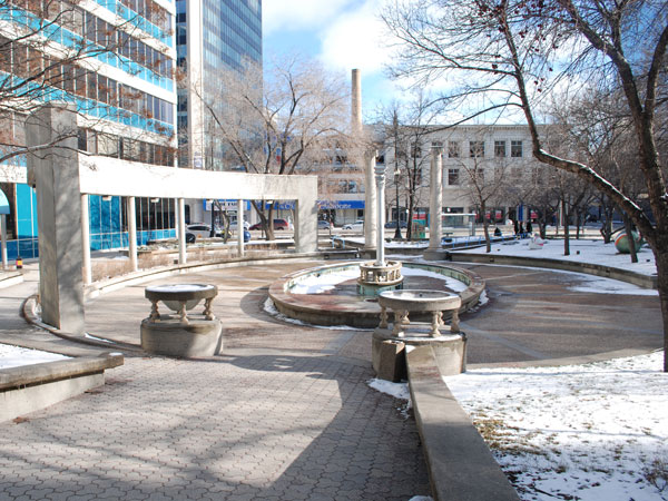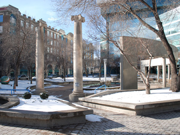 The park featured structural shards from other recently demolished local structures, incorporating them in the design, layout, and aesthetic of the grounds. The salvaged and recycled artifacts included two Tyndall limestone columns from the Northern Crown Bank Building (654 Portage at Maryland Street, built 1908, demolished 1983), decorative Tyndall limestone balustrades used for supporting raised floral beds, a decorative centrepiece at the middle of the park’s central fountain from Devon Court (demolished circa 1982), and a cast iron pillar designed by the Vulcan Iron Company from the McIntyre Block (demolished 1979) set upon a raised platform in the fountain pool. An array of pink-coloured ceramic tiles which were previously part of the park’s display were removed sometime before the mid-2010s.