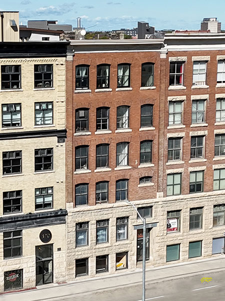 This five-storey brick and stone warehouse annex on Donald Street in Winnipeg, measuring 50 feet by 90 feet, was designed by local architect Herbert Edward Matthews and built in two stages. The first three floors were constructed in 1905 by contractor Francis “Frank” Powell, along with the building next door, and the upper two floors were added in 1911.