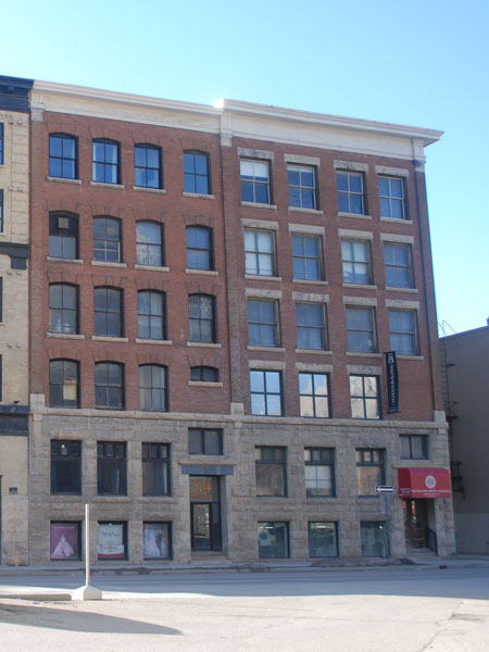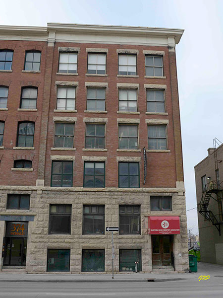 This five-storey brick and stone warehouse on Donald Street in Winnipeg, measuring 39 feet by 90 feet, was designed by local architect Herbert Edward Matthews and built in two stages. The first three floors were constructed in 1905 by contractor Francis “Frank” Powell, along with the building next door, and the upper two floors were added in 1909.