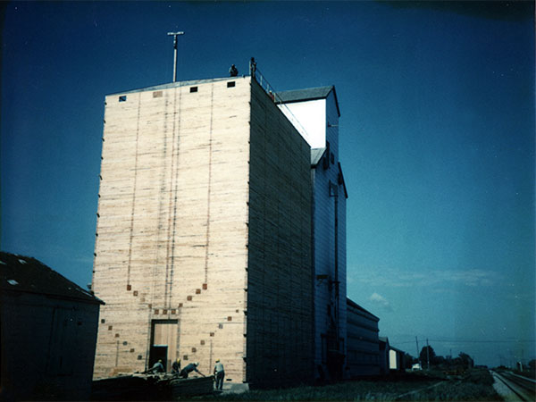 An annex under construction beside the former Manitoba Pool grain elevator at Alexander (July 1980)