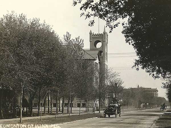 Named for King Edward VII’s consort, Alexandra School was built on the east side of Edmonton Street, between York and St. Mary avenues (where the Winnipeg Convention Centre now stands), between 1902 and 1903, by the Kelly Brothers. A true showplace of the time, it was designed by Architect and Commissioner of School Buildings James Bertram Mitchell. Alexandra School became a template for many of his best school designs. Originally a two-storey building, and intended to alleviate overcrowding at Carlton School, the third floor was added when enrolment justified it. Downtown Winnipeg changed from a business/residential mix to almost all businesses. Four homes at the rear of the school building were removed to make room for expansion.