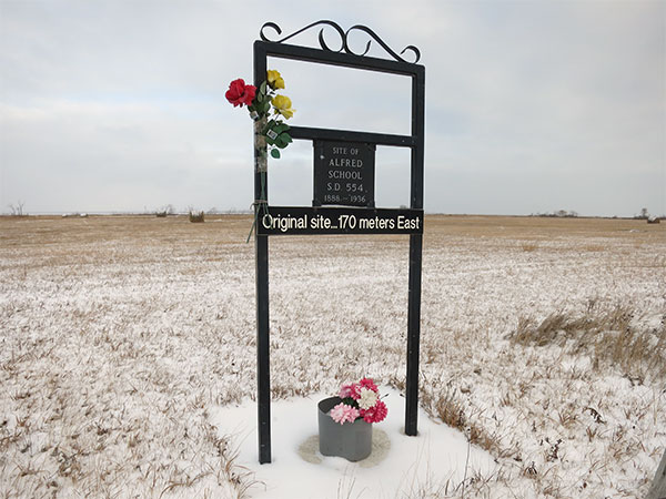 The Alfred School District was established formally in September 1888 and a one-room schoolhouse operated at this site in what is now the Rural Municipality of Alonsa. Population growth in the area in the late 1940s was such that a second school, known as Alfred School #2, had to be built at another site. The original school closed in 1964 and students were bused to Alonsa. A metal sign commemorates the former school.