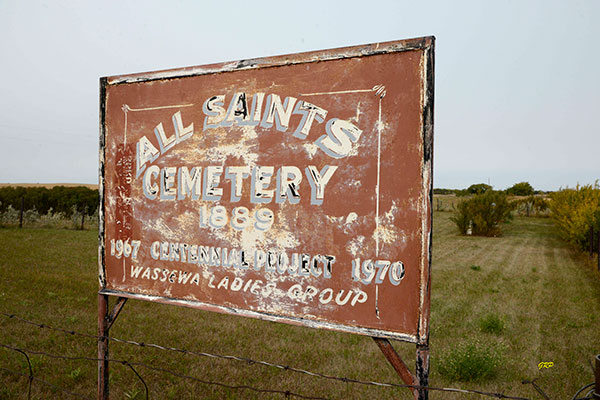 This cemetery is situated in the Municipality of Boissevain-Morton, on the site of the former All Saints Anglican Church, a wood frame building designed by local resident Arthur Sheppard Barton and built here in the spring of 1888. The church was consecrated by Archbishop Machray at a service on 26 May 1888. The first burial in the adjacent cemetery occurred in 1893 and it is alleged there are six graves in total. The church closed in 1929 and the building was moved to the Horton district and converted into a private residence. A fence around the cemetery was erected by the Wassewa Ladies Group.