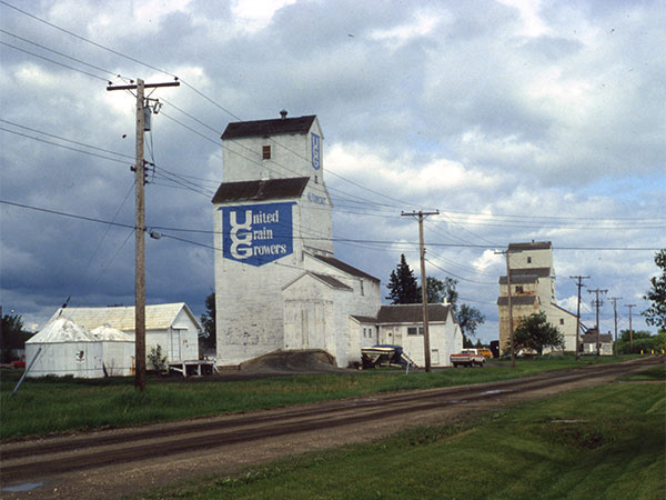 The UGG grain elevator (left) with Manitoba Pool (right) at Altamont (1981)