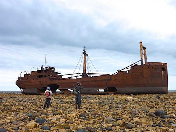This shipwreck sits just outside Bird Cove, 12 miles east of Churchill, high and dry when the tide is low and completely surrounded by water at high tide.
