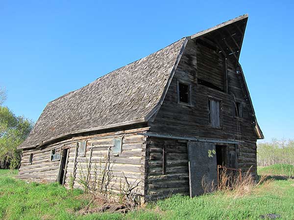 Two miles west of Dauphin on #5. It was built in the early 1920s by Hubert Izon, an English First World War veteran who had been gassed and wounded in France. Timber came from the Riding Mountains to the south and spaces between the logs were filled with a mixture of lime and horsehair. The barn was sold to municipal reeve John Potoski in 1959.