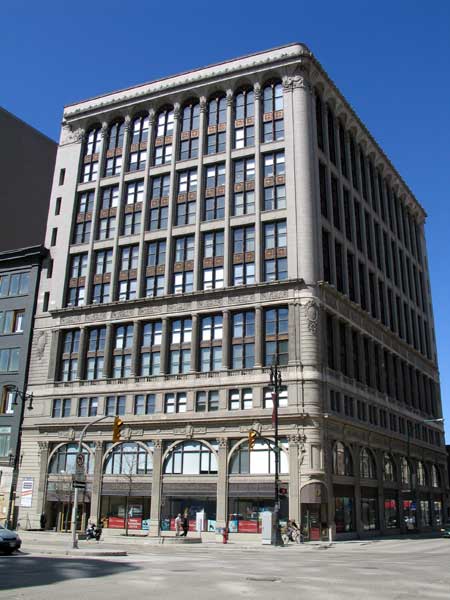 The 11-storey Paris Building at the corner of Portage Avenue and Gary Street was built on behalf of the Paris Canadian Investment Company (hence, its name) in two stages. The first five storeys were put up in 1915 and the upper six floors were added in 1917. Aside from incidental renovations, the building has mostly retained its original appearance, which features terra cotta prominently. Terra cotta is highly ornamented and colourful ceramic made from baked clay. Durable and attractive, yet relatively inexpensive, it was widely used in the early 20th century but is rarely used today except for repairs on these older buildings. There are over a dozen fine examples of terra cotta in Winnipeg’s downtown, and I encourage listeners to check out the Winnipeg Architecture Foundation’s excellent tour on this subject.