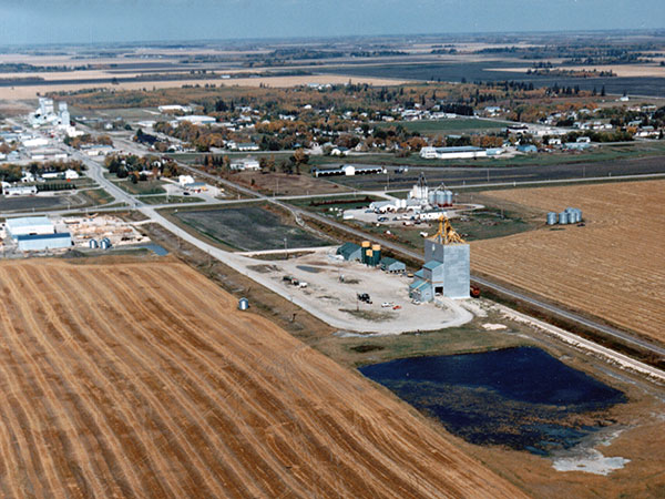 Aerial view of grain elevators at Arborg with Pool D in the foreground (1987)