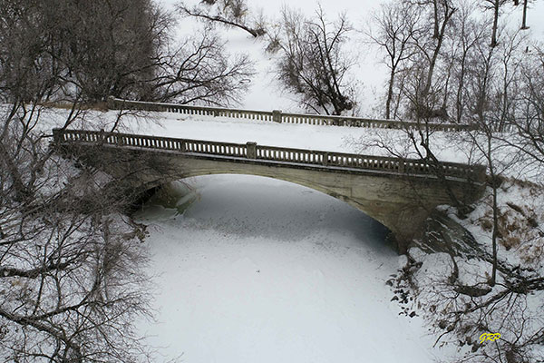 Concrete arch bridge over the Whitemud River near Arden (February 2021)