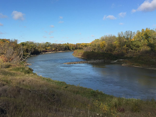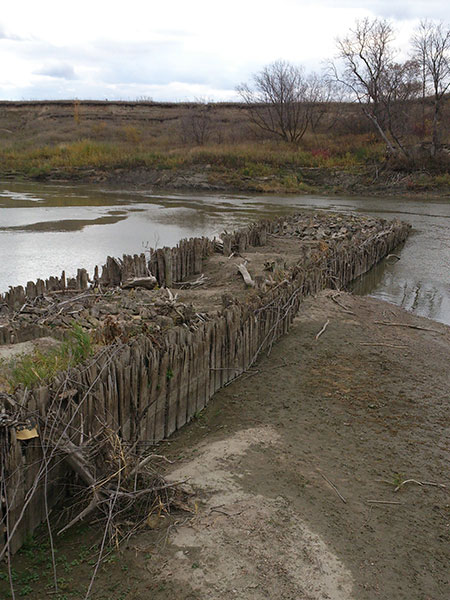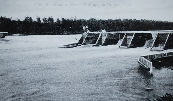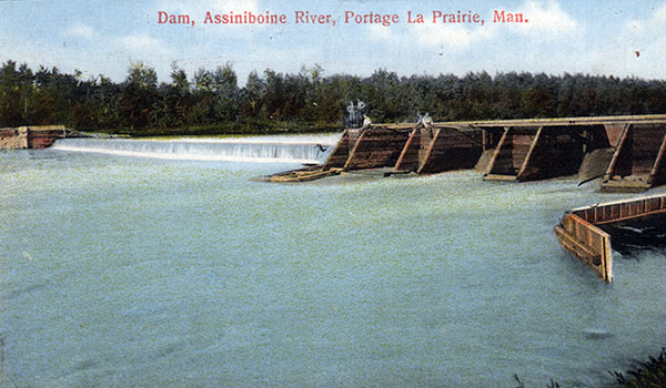 A wooden structure in the Assiniboine River in the Rural Municipality of Portage la Prairie, south of Portage la Prairie, was a former needle dam commissioned in late 1909 by the Public Parks Board of the City of Portage la Prairie. With completion contractually due by 20 February 1910, construction began in late 1909 by the contracting firm of Lauren B. Merriam and H. J. Symington (operating as Merriam & Symington), based on designs from the Toronto engineering firm of Smith, Kerry, and Chace. Intended to redirect water into nearby Crescent Lake, the design was found to be faulty almost immediately after it was built. River water seeped under the dam and eroded the soil so the dam would not hold water. By March 1911, the metal parts of the needle dam were being removed, leaving the remaining wooden parts in place.