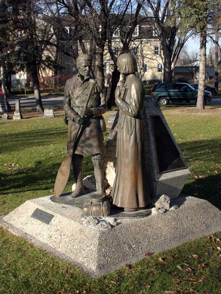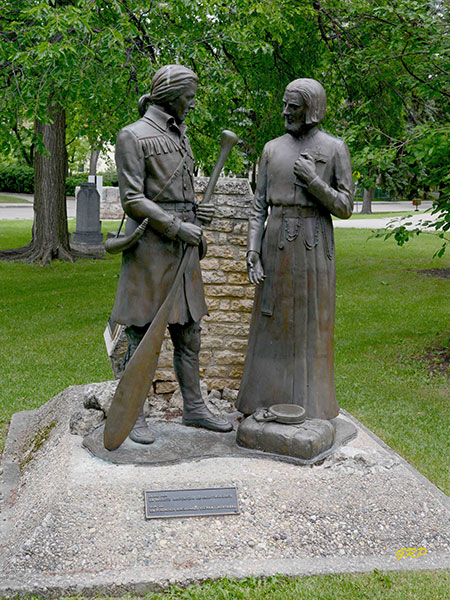 A memorial in the St. Boniface Cathedral Cemetery on Tache Avenue in Winnipeg, erected by La Société Historique de Saint-Boniface, features sculptures of missionary Father Jean Pierre Aulneau, Jean Baptiste La Vérendrye, and 19 others who were killed on an island in the Lake of the Woods on 6 June 1736.