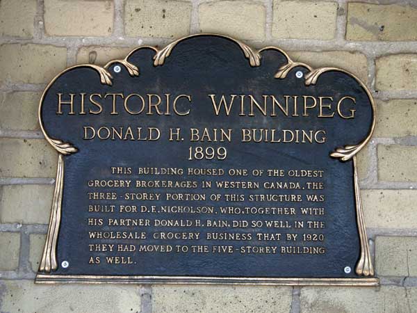 This building, designed by local architect James McDiarmid and constructed in 1899, housed one of the oldest grocery brokerages in western Canada. The three-storey portion of this structure was built for Edward Nicholson who, together with his partner Donald Henderson Bain, did so well in the wholesale grocery business that, by 1920, they had moved to the neighbouring, five-storey Merrick-Anderson Building. A plaque is mounted on the west side of the main (south side) entrance of the building, now a municipally-designated historic site.