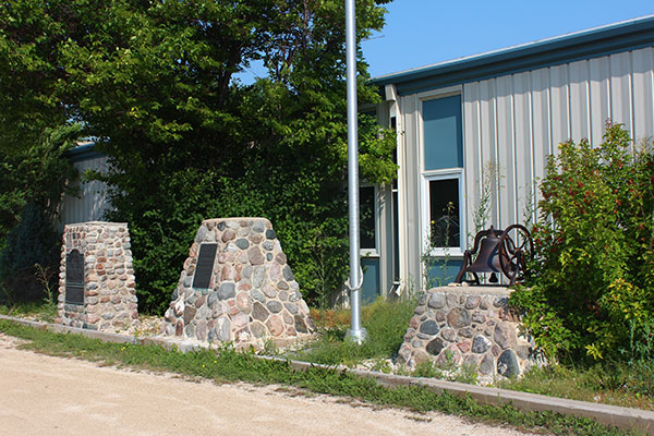 Located in Balmoral, a set of three monuments commemorate local residents who died serving in Canadian military forces during the First World War and the Second World War, as well as pioneers of the Balmoral area. The first European settlers arrived in this area in the early 1870s and, in 1877, a Methodist church was constructed on land belonging to John Peden. A year later, the Balmoral School District No. 44 opened, named after Balmoral Castle in Scotland. The Canadian Pacific Railway arrived in the area in 1898, a grain elevator was constructed by the Northern Elevator Company, and Balmoral became a thriving agricultural community.