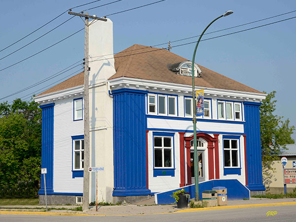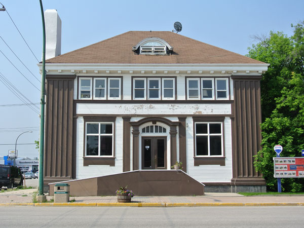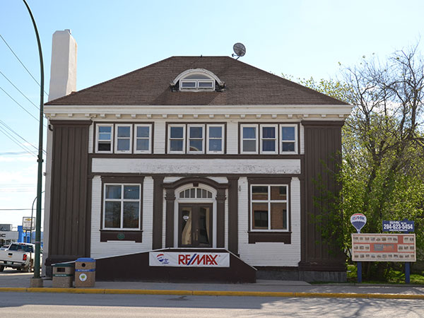 This two-storey wood building in The Pas was constructed in April 1912, using standardized plans provided the Toronto architectural firm of Darling and Pearson, as a branch of the Canadian Bank of Commerce. Opened officially on 2 July 1912, the bank occupied the main floor while residential space on the second floor was occupied by bank clerks. Closed in 1937, the building was then used as law offices by John A. Campbell and D’Arcy Bancroft. In 2005, the building, now a real estate office, became a municipally-designated historic site.