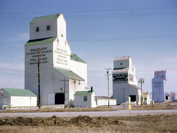 Manitoba Pool B grain elevator at Beausejour in foreground, with UGG 1 and UGG 2 elevators and Pool A grain elevator in the background (1962)
