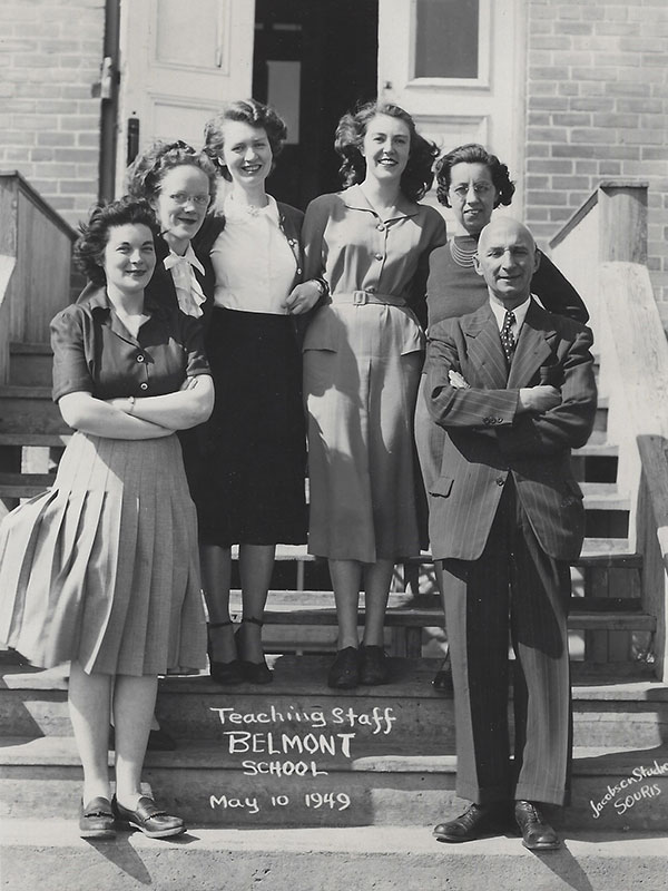 Teaching staff of Belmont School, 1948-1949. Elisabeth Nash is third from left and Principal Henry L. Williams is at right. (May 1949)