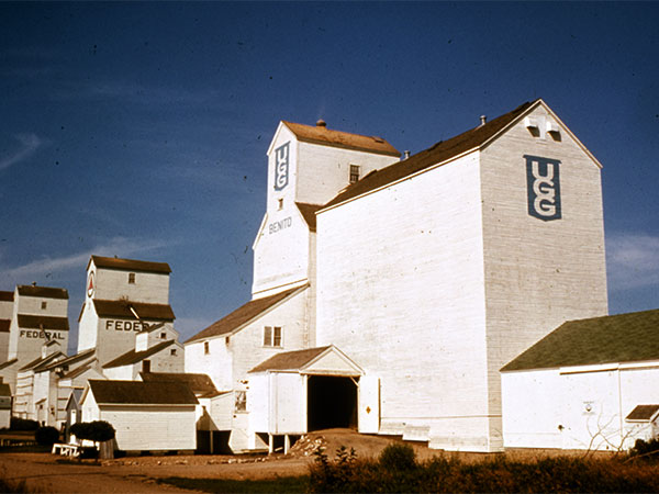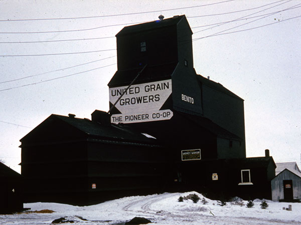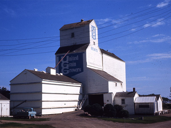 A wooden grain elevator at Benito, on the CNR Preeceville Subdivision in what is now the Municipality of Swan Valley West, was built in 1937 by United Grain Growers to replace an elevator destroyed by fire on 3 June 1937. Temporary balloon annexes were constructed beside it in 1940 and 1941, and crib annexes were added in 1948 and 1956. Closed in July 1997, the facility was demolished later that year.