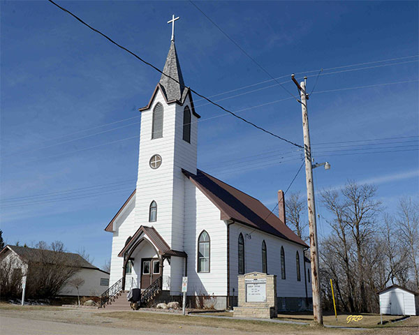 This Lutheran church in Inglis, in the Rural Municipality of Riding Mountain West, was built in 1918 at a site east of here, and moved here in 1950.