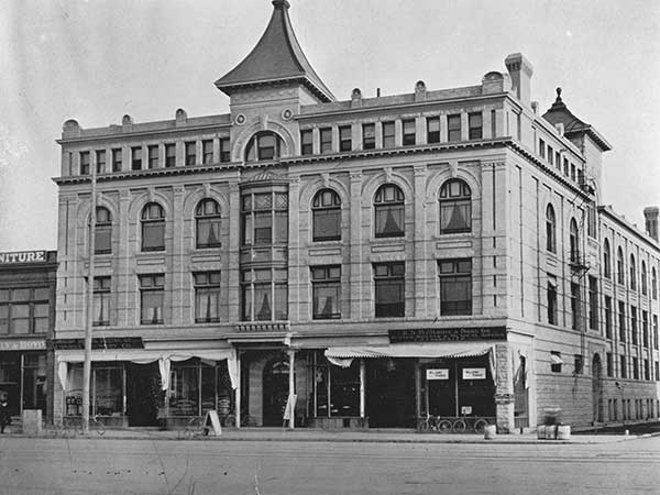 A lot at the southeast corner of Portage Avenue and Smith Street was purchased in 1890 by the Young Men’s Christian Association (YMCA) for construction of its first permanent facility in Winnipeg. It took several years to plan and fundraise for the four-storey building that was designed by architect George Creeford Browne and constructed by John Alexander Girvin and Philip Burnett at a cost of $68,500. It held offices, a public reading room, a 150-seat lecture hall and 600-seat auditorium, library, meeting and classrooms, boys quarters (with reading room and parlour), furnished bedrooms on the upper levels, and dormitories on the fourth floor. The gymnasium featured Winnipeg’s first indoor swimming pool and two bowling alleys.