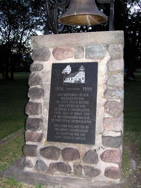 Zion Methodist Church was built at Birnie, in the Rural Municipality of Rosedale, in 1906. It became Zion United Church in July 1919, serving its congregation until 1988 when the church building was demolished due to structural deterioration. A monument, topped by the former church bell, commemorates the church and its service to the community.