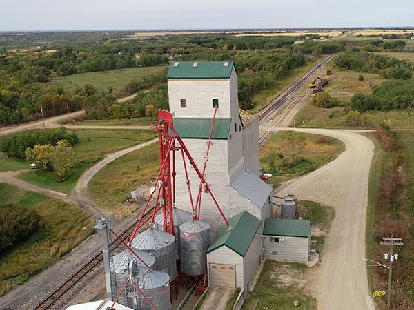 Aerial view of the former Manitoba Pool grain elevator at Birtle (September 2020)