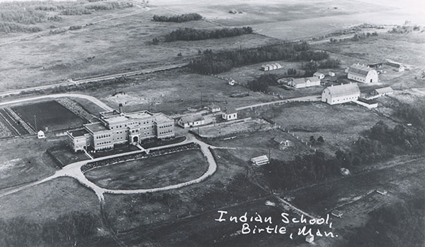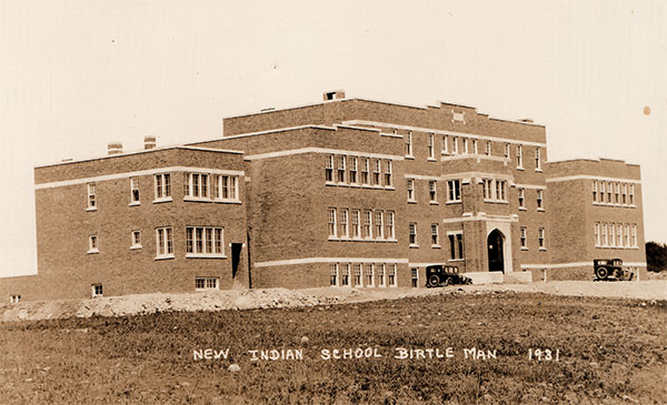 In 1894, a dedicated Indian Residential School was built at this site, on a hill overlooking Birtle. A pile of gray stones from its foundation are visible down the hill. A new three-storey orange brick and Tyndall Stone school building, measuring 54 feet by 174 feet, was designed by Roland Guerney Orr (1888-1937), Chief Architect for the Department of Indian Affairs at Ottawa. It was constructed between 1930 and 1931 by the Claydon Brothers Construction Company of Winnipeg, supervised by Brandon architect Walter Henderson Shillinglaw, at a cost of about $180,000. Subcontractors included Western Gypsum Products Limited and Port Arthur Shipbuilding Company (millwork), MacDonald Brothers Limited (sheet metal and roofing), Levvy Electric Company (electrical), Manitoba Bridge and Iron Works (structural steel), and Connechle and Forsyth (plastering). It was opened officially at a ceremony on 29 October 1931 attended by Reverend M. Floyd, Indian Agent P. Lazenby, Mrs. J. S. Hutchison of Winnipeg, Dominion Secretary of Indian Affairs Mrs. D. T. McKerroll, and Mrs. H. A. Robson of the Presbyterian Church.
