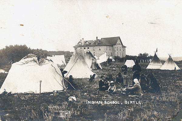 The first facility at Birtle used for the education of Indigenous children, in what is known now as the Municipality of Prairie View, was known as the “Stone School”. Built in 1882, it was situated two blocks west of the Main Street bridge. Originally built as a school for the children of Birtle, Mayor John Sanderson Crawford persuaded the federal government in 1890 to lease the building as a boarding school for Indigenous children from surrounding reserves. They used it for a year or two then town children returned to the Stone School until it burned on 20 November 1895.