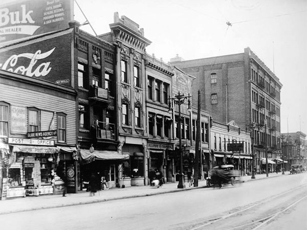 East side of Main Street, between Henry Ave and Logan Ave, with Bon Accord Block in background (1918) by Robson Studio