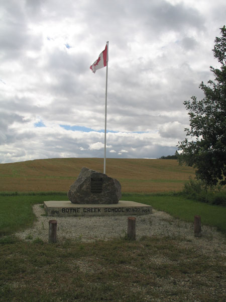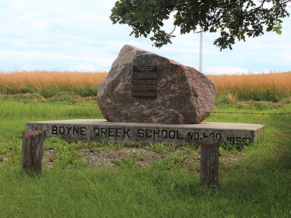 During its 68 years of operation, there were 235 students in grades 1 to 8, taught by 57 different teachers. The school also served as a community social centre. In 1901, municipal boundaries were realigned placing the school in the Rural Municipality of Victoria. School consolidation in January 1959 resulted in the closure of Boyne Creek School in June of that year, with the remaining students going to Treherne Consolidated School No. 537. The school building was then sold and moved to another site. A commemorative monument was erected in July 1994 on land donated by Ray and Leona Timmerman and family, and dedicated to the students, teachers, and residents of the Boyne Creek district.