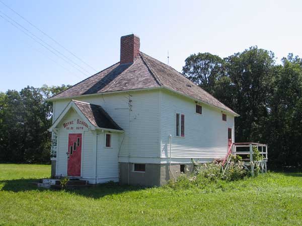 Established in December 1872, the Boyne School District occupied a log building in the northwest quarter of 22-6-4 west of the Principal Meridian, known locally as the Salterville Schoolhouse. In 1893, a much larger wood frame structure was erected beside it, with separate entrances for boys and girls. It was used until 1930 when a replacement was built and the earlier school was sold to a local farmer for use as a residence at SW2-7-4W (about N49.53555, W97.90791). It was demolished in August 2022.