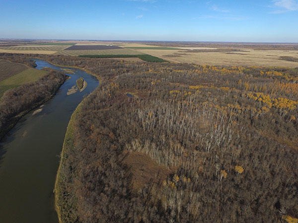 Aerial view of the treeless clearing in the foreground that was once occupied by Brandon House No. 1, near the Assiniboine River (October 2017)
