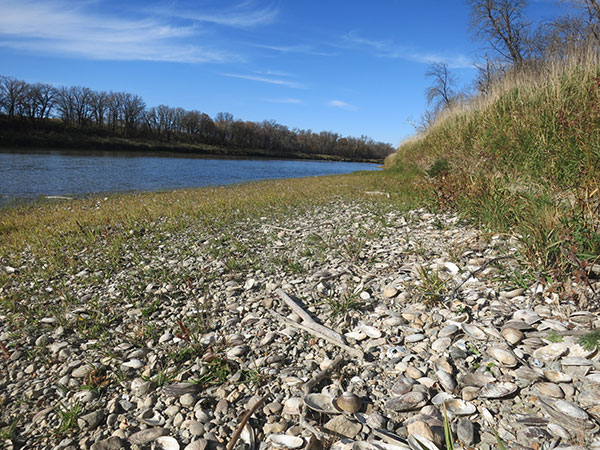 Numerous empty clam shells, possibly discarded by the occupants of Brandon House No. 1, litter the river bank near the site (October 2017)