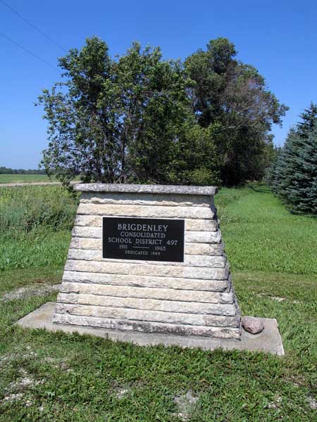 A monument, situated in the southwest corner of 17-6-3 west of the Principal Meridian in the Rural Municipality of Dufferin, commemorates Brigdenley Consolidated School. Formed in December 1909 from the consolidation of Brigden School No. 497 with McKinley School No. 1462. Brigden School had been established in April 1887 and operated at the same location, whereas McKinley School was only established in May 1908 and a building for it was never constructed because local residents decided it made more sense to transport their students to Brigden School and pay the district a non-resident fee. The experiment was successful so, a year later, the two school districts merged as Brigdenley Consolidated School. The building measured 26 by 40 feet, situated on two acres of land. The school closed in 1966 and its catchment was dissolved in January 1968 into the Carman Consolidated School District No. 176 (which in turn was amalgameted into the Midland School Division).