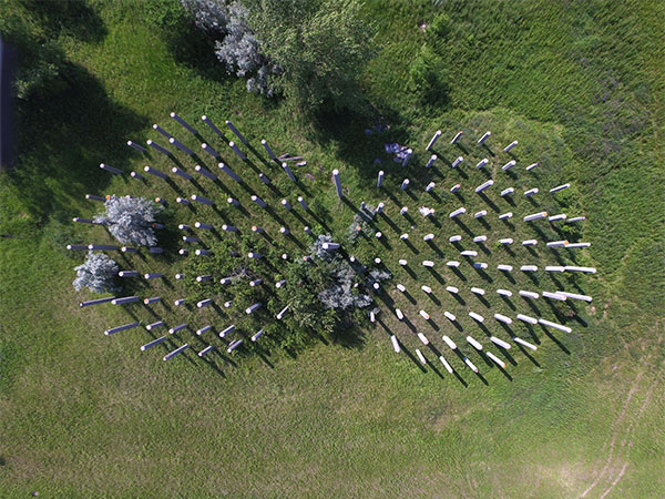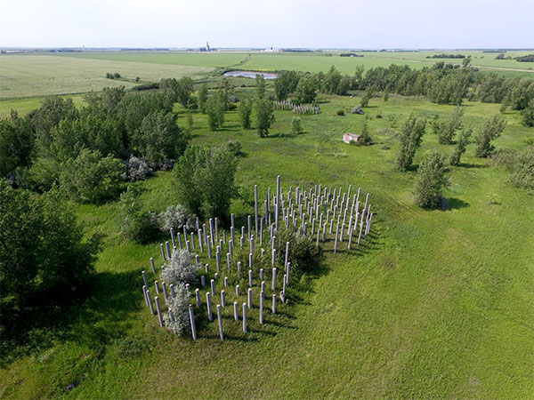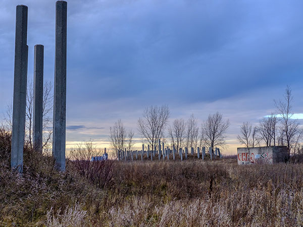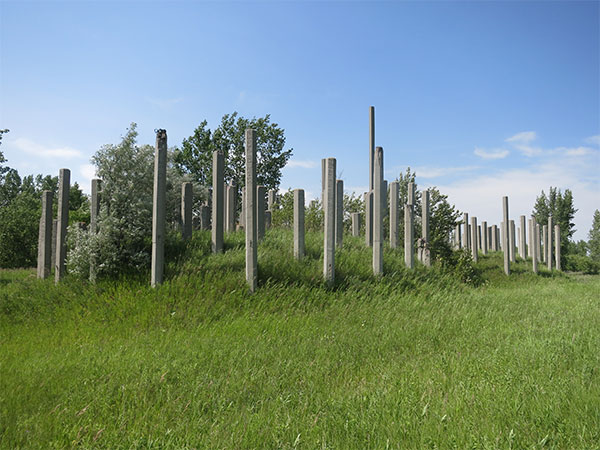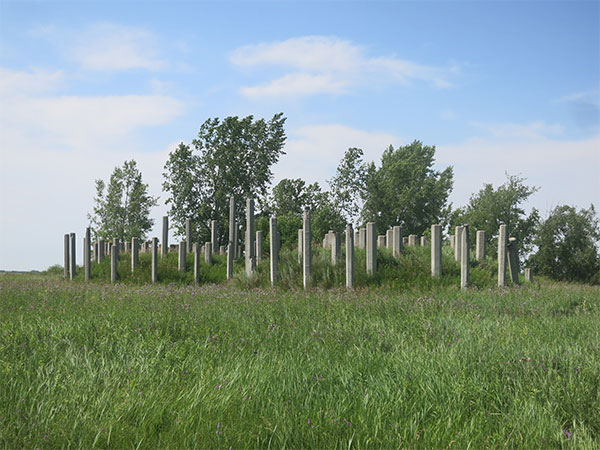 This site along Sturgeon Road in the Rural Municipality of Rosser is about 40 acres in area with an abandoned railway line through it from the CPR main line. Within the area are four large mounds that stand at least eight feet high, in two pairs, with numerous concrete pillars protruding from each mound. If one looks from above, each mound is seen to be almost perfectly circular and the pillars are oriented in a neat grid. The two mounds nearest Sturgeon Road are the largest, each about 70 feet in diameter, while two farther from the road are smaller, about 50 feet in diameter.