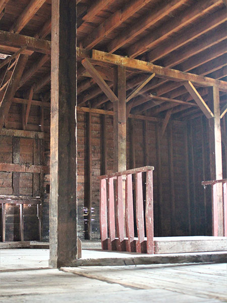 The rectangular, two-storey building with gable roof was constructed in 1902 by local entrepreneur David McNaughton and its wooden walls were covered with overlapping metal panels. The main floor had a small office in the southeast corner. The rest of the building was a large room with a large south-facing door for unloading grain sacks from horse-drawn farm wagons and a north-facing door for loading them into railway boxcars sitting on the tracks that run past the warehouse. A ladder near the south door led to a second floor used for longer-term storage.