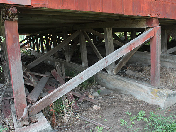 Brookdale Grain Warehouse showing the decrepit wooden stairs leading into the office on its southeast corner (June 2016)
