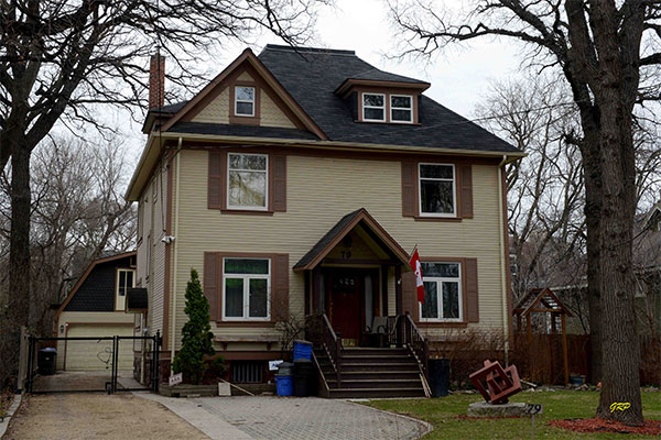 This two-storey wood frame structure on West Gate in the Armstrong’s Point area of Winnipeg was designed by local architect Edmund Walter Crayston and built in 1911 for businessman John Derby Brook. It was renovated into a duplex in 1947.