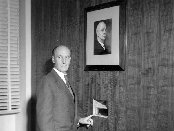 Buller cremains being installed in a wall cavity, below a photograph of Buller, in the Buller Memorial Library at the now-demolished Agriculture Canada building at the University of Manitoba (1958)