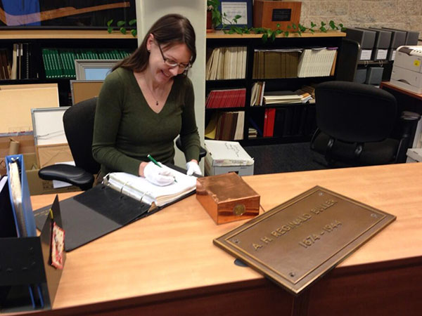 Copper box containing the Buller cremains, along with the brass wall plaque that covered the wall cavity in the now-demolished Buller Memorial Library, being accessioned at University of Manitoba Archives & Special Collections (November 2013)
