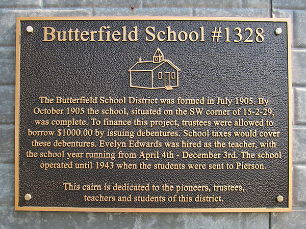 The Butterfield School District was established formally in May 1904 and, by October 1905, it opened a school on the southwest corner of 15-2-29W in what is now the Municipality of Two Borders. The school closed in 1943 and, henceforth, students from this area went to Pierson School. As of 2021, the building still stands on the privately-owned site and is used for storage. A plaque fastened to one of its walls commemorates the school.