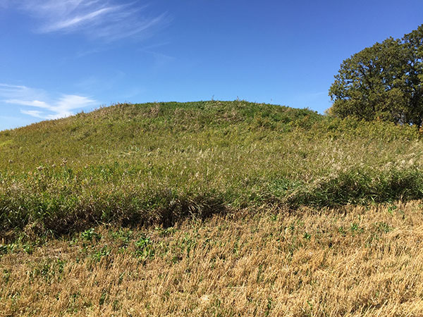 This ancient burial mound south of Darlingford in the Municipality of Pembina is the landmark most frequently mentioned in early records of southern Manitoba. Pioneers attributed its construction to an extinct race of mound builders and opened it several times during the early years of settlement in the hopes of discovering some clue as to their fate. In addition to copper from Michigan and shells from the Gulf of Mexico and Vancouver Island, more than 20 skeletons in a sitting position were uncovered.