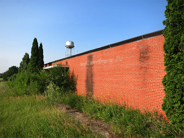Overgrown entrance to the administrative offices of the former Campbell Soup plant at Portage la Prairie (July 2017)