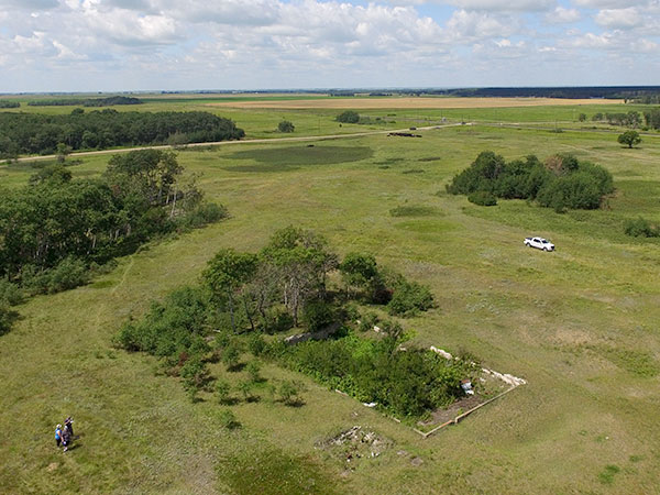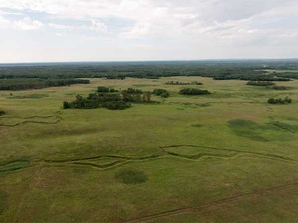 Aerial view of trenches remaining from the Camp Hughes training facility (July 2015)