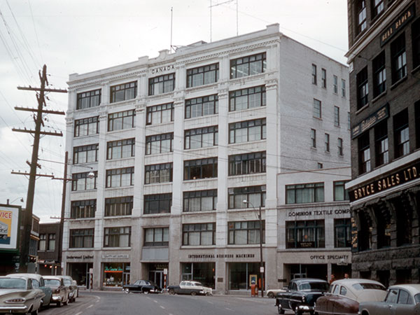 This seven-storey building was designed and built in 1910 by the J. McDiarmid Company. Through the years, the main floor has provided space for a variety of small merchants, including watchmakers, tailors, barbers, and photographers. Companies on upper floors have included the Dominion Business College, Manitoba Power Commission, James Richardson and Sons, Dominion Bridge Company, Air Canada, Manitoba Housing and Renewal Corporation, and Manitoba Heart Foundation. In 1924, McDiarmid sold the building to lawyer Allan Bronfman. Twenty-five years later, he sold it to Brian Investments Limited. The building is a municipally-designated historic site.