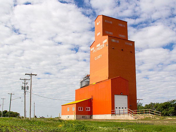 Two grain elevators in Carey, on the CPR Emerson Subdivision in the Rural Municipality of DeSalaberry, were owned by the Pioneer Grain Company, a subsidiary of James Richardson & Sons. The smaller of them was purchased in 1971 from Manitoba Pool Elevators. The brightly-coloured orange elevator was said to be a particular favourite of family patriarch George T. Richardson because it was the first one that he owned. Both buildings have been demolished since the 1990s, the last in October 2014.