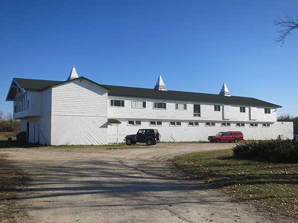 Built in 1963 for businessman Gordon Stanley Carpenter, this two-storey housebarn (attached barn and residential space) along the Assiniboine River, west of Headingley in the Rural Municipality of St. Francois Xavier, featured unusual pyramid-shaped cupolas, with horse stables on its lower level and a four-bedroom accommodation for staff on its upper level. Known as Marshall Brook Farms (named for Marshall Brook Motors, Carpenter’s used-car dealership in Winnipeg), the facility had a lounge and tack shop while property to the immediate east, owned by grain merchant George Sellers, had an indoor riding arena and galloping track. An inaugural horseshow was held at the site on 22 December 1963.